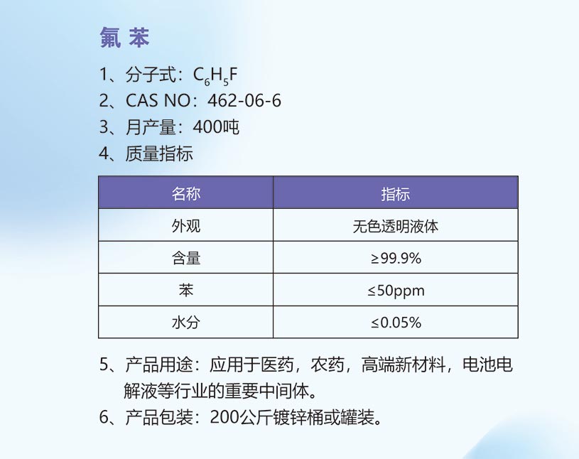 医药中间体氟苯:无色液体。熔点-42℃。沸点85℃。折射率(nD20)1.4650。相对密度(d420)1.024。不溶于水,能与乙醇、乙醚、丙酮、苯混溶。由苯胺经席曼(G. Schiemann)反应制取。